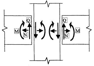 3.2.1. В общем случае в сечении стыка ригеля с колонной действуют продольная и поперечная (относительно ригеля) силы, изгибающий и крутящий момент (рис. 14). В рассматриваемых конструкциях стыков ригеля с колонной вертикальная опорная реакция передается на консоль, поэтому влияние поперечных сил на работу сопряжения можно не учитывать.