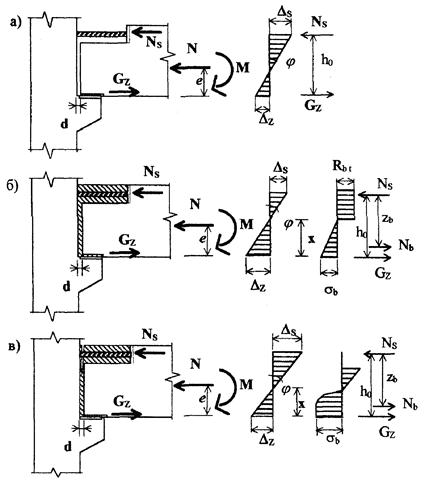 Дли сопряжений рис. 3 защемление носит односторонний характер. При действии изгибающего момента в сторону пролета узел «раскрывается» (рис. 3, в) и опорные моменты малы поскольку на изгиб работают только опорные закладные детали, при действии изгибающего момента в другом направлении происходит обжатие шва омоноличивания и возникает пара сил (рис. 3, в). Поскольку опорные закладные детали обладают податливостью, а бетон омоноличивания, как правило, имеет более низкую прочность чем бетон сопрягаемых конструкций, то узел обладает меньшей изгибной жесткостью чем сечения ригеля.