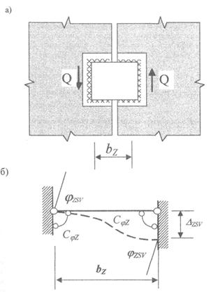 2.3.4. В узлах сопряжения ригеля с колонной связевого каркаса без монтажных соединений по верхней зоне (рис. 3, б) после сварки опорных закладных деталей и омоноличивания швов наряду с сопротивлением сжатию-растяжению возникает сопротивление повороту ригеля относительно колонны, т.е. имеет место частичное защемление колонны в диске перекрытия.