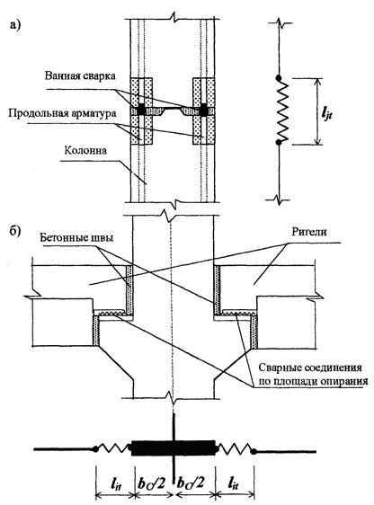 1.5. Деформативность (в дальнейшем податливость) стыков несущих элементов каркаса - колонн, ригелей, плит перекрытий, элементов диафрагм жесткости и фундаментов может быть вызвана следующими факторами: снижение расчетных стыкуемых площадей конструкций для обеспечения соединений арматуры; обмятие бетона конструкций и шва по контактным поверхностям и развитие, вследствие этого, неупругих деформаций; пониженная трещиностойкость и сопротивляемость развитию трещин бетона шва; податливость сварных соединений арматуры и закладных деталей и т.д.