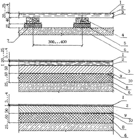 1 - покрытия; 2 - клеевой слой; 3 - основание пола из досок или древесно-стружечных плит; 4 - лаги 40´80 мм; 5 - звукоизоляционные ленточные прокладки из ДВП; 6 - несущая плита перекрытия; 7 - слой толя; 8 - звукоизоляционный сплошной слой; 9 - стяжка из лёгкого бетона; 10 - слой толя или пергамина