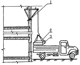 1 - кран «в окно»; 2 - строп четырехветвевой; 3 - контейнер с древесно-волокнистыми плитами