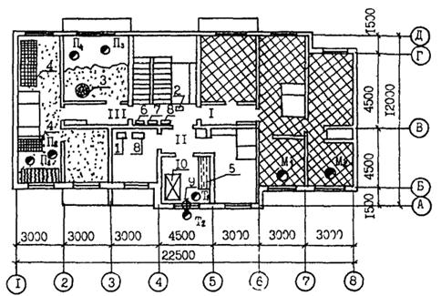 I, II, III - номера квартир; 1 - пылесос; 2 - циркульная пила; 3 -бачок c мастикой; 4 - древесно-волокнистая плита под пригрузом; 5 - плинтусы; 6 - ящик с гвоздями; 7 - емкость с грунтовкой; 8 - ёмкость со шпаклевкой; 9 - кран СР; 10 - место приемки материала