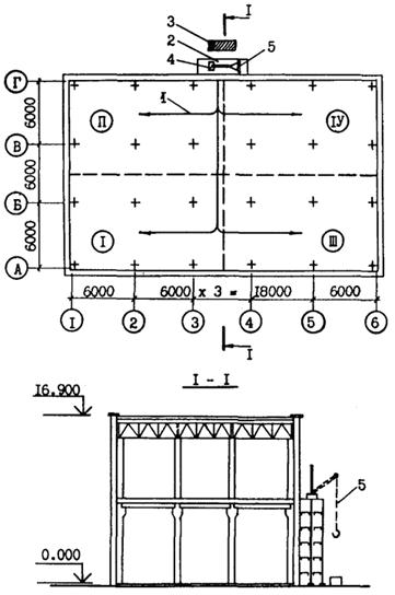 1 - направление подачи материалов; 2 - площадка для приема материалов; 3 - место разгрузки материалов; 4 - ручная тележка; 5 - кран Т-108А