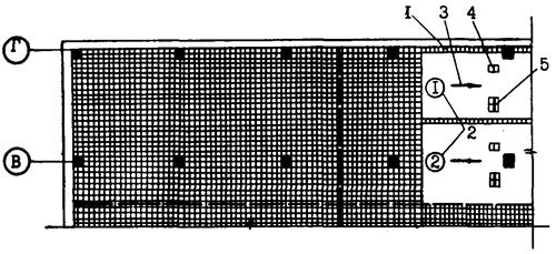 1 - фризовый ряд; 2 - номера звеньев; 3 - направление работ на делянке; 4 - фляги с мастикой; 5 - места разгрузки поливинилхлоридной плитки