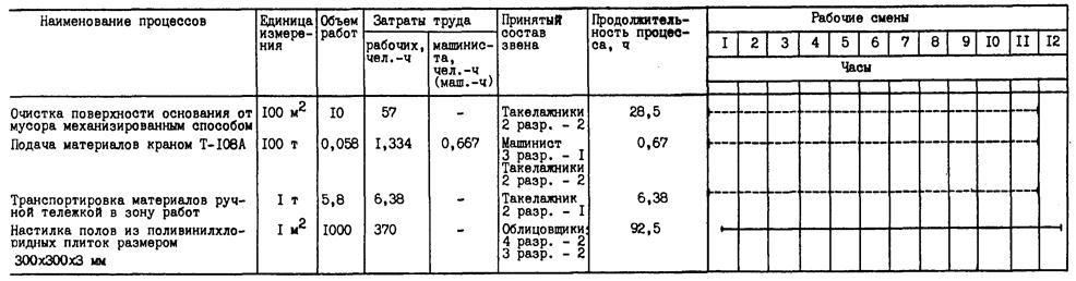 Устройство пола из поливинилхлоридных плиток выполняется бригадой из 4 звеньев (в том числе 2 звена на подготовке основания и транспортных работах).