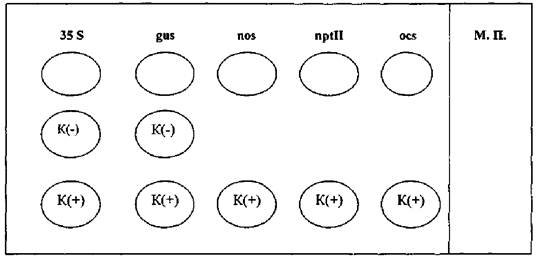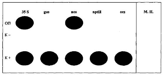 12.2. Отсутствие регистрируемого оптического сигнала во всех пяти гибридизационных зонах, содержащих иммобилизованные олигонуклеотиды, указывает на неимение рекомбинантной ДНК, что свидетельствует о том, что анализируемый образец (проба) не имеет ГМО растительного происхождения.