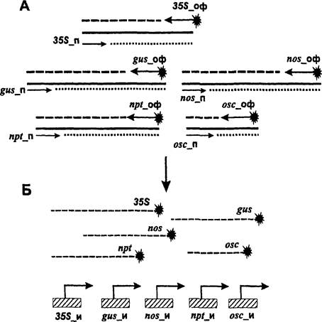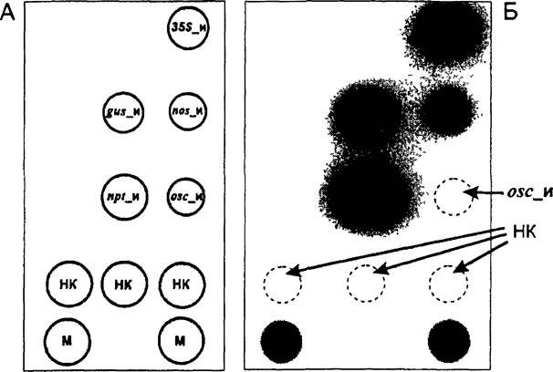 Б - гибридизационная картина на биологическом микрочипе флуоресцентных продуктов амПЦР анализируемой ДНК, содержащей промотор 35S, гены gus и nptII, a также промотор nos. Пунктиром обозначены гелевые ячейки биологического микрочипа с уровнем флуоресценции, близким к фоновой, не достигающим заданного в программе Imageware порога чувствительности.