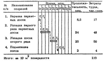 Нарезка паркетной доски; 8,5 мин.; П1 и П2; распиловочная машина, метр складной. Паркетчик П1 размечает доску при помощи метра и карандаша по необходимым размерам, а паркетчик П2 производит распиловку ее на распиловочной машине (рис. 1). |