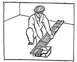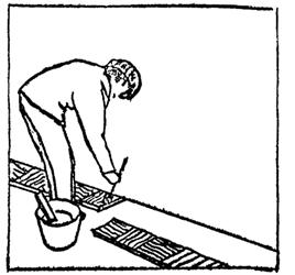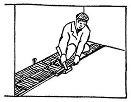 Укладка досок второго ряда; 25 мин.; П1 и П2; кисть филеночная, молоток. Паркетчик П2 подносит доску к месту укладки и наносит на продольный гребень дисперсию ПВА при помощи кисти. Паркетчик П1 плотно подгоняет доску к ранее уложенной доске первого ряда, следя за тем, чтобы гребень последующей доски целиком зашел в паз предыдущей, затем сплачивает доски молотком через деревянную прокладку (рис. 4). |