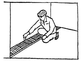 4.1. Работы по укладке паркетных мозаичных досок выполняют в следующем порядке: первую доску укладывают по шнуру на расстоянии 10 - 15 мм от стены, в торец к первой доске укладывают вторую доску, предварительно промазав торец дисперсией ПВА и т.д. вдоль всей стены; в зазор между досками и стенами устанавливают деревянные клинья на расстоянии 50 - 60 см друг от друга. Укладка второго и следующих рядов производится с плотной подгонкой друг к другу, следя за тем, чтобы гребень последующей доски целиком зашел в паз предыдущей. На продольный гребень перед введением его в паз наносят точечно через 40 - 50 см дисперсию ПВА. Излишки дисперсии выступившей на лицевое покрытие должны быть немедленно удалены влажным тампоном. Стыковку торцов паркетных досок допускается производить только соединением «гребня в паз». Последний ряд досок должен быть подогнан по размерам и надежно поджат к предыдущему с использованием клиньев. Клинья располагают в той части доски, где лицевое покрытие расположено поперек длины доски. На каждую доску полной длины следует устанавливать не менее 4-х клиньев.