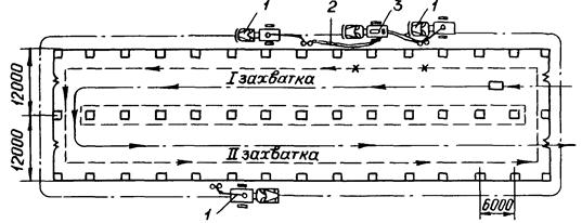 1 - вышка строительная ВС-22-МС; 2 - рукава для подачи материала и воздуха; 3 - автомобиль с компрессором и емкостью для краски