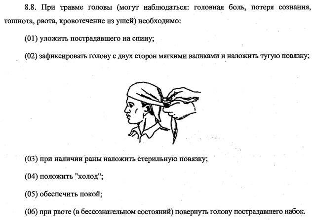 (02) уложить пострадавшего на спину, подложив под голову подушку (сверток из одежды и т.п.);