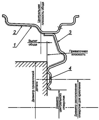 1 - внутренняя поверхность колеса; 2 - обод; 3 - диск; 4 - отверстие для крепления
