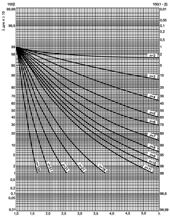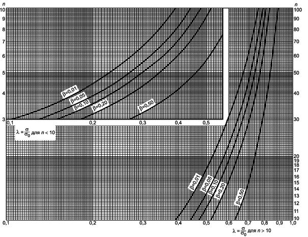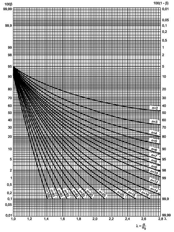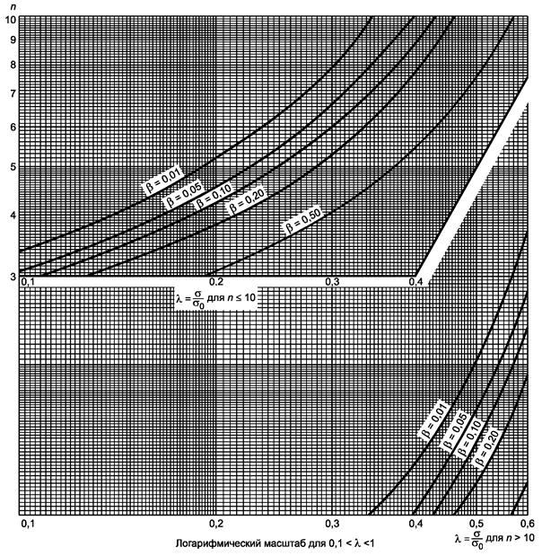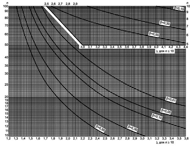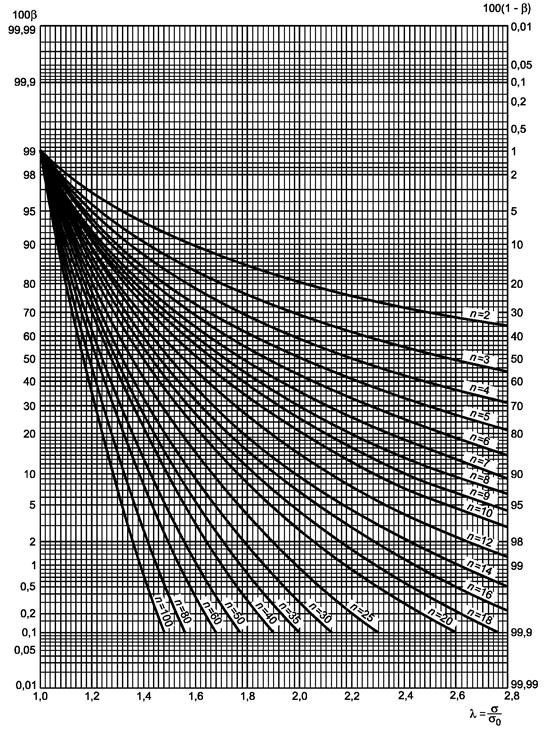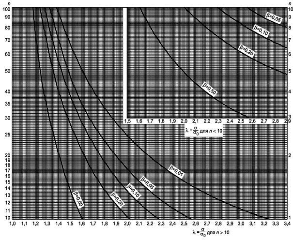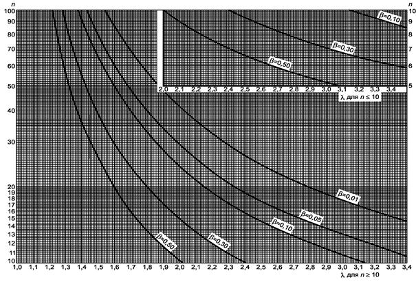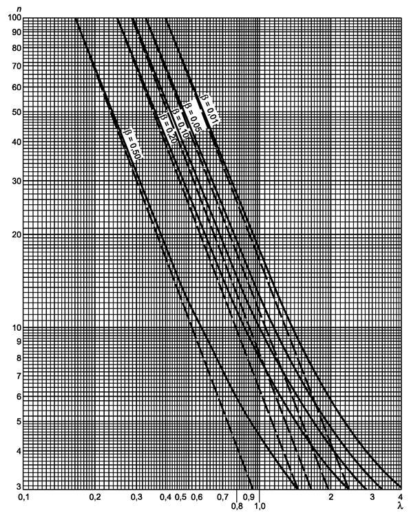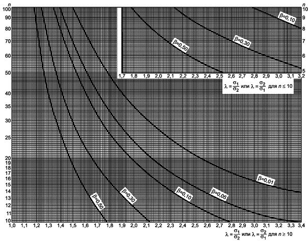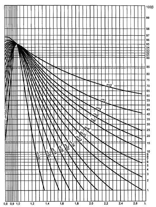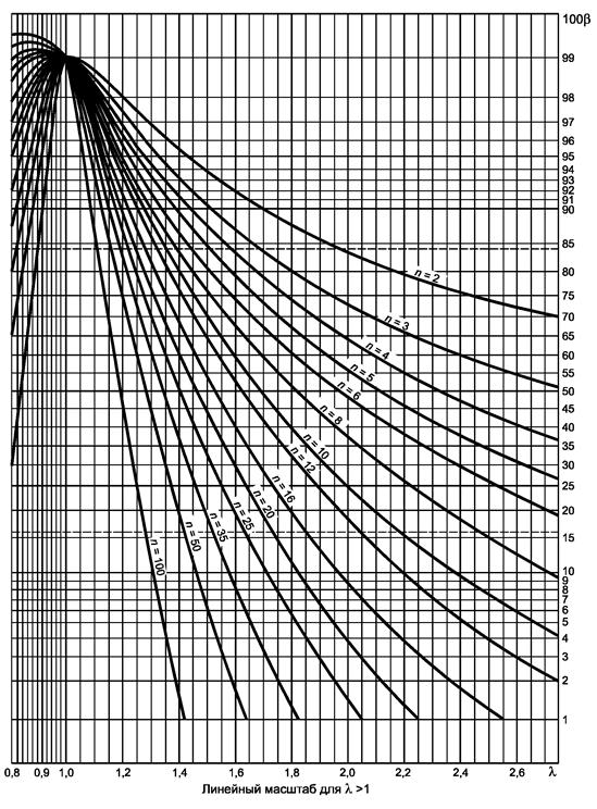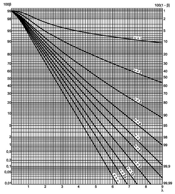 - наборы кривых 1.2 - 14.2, задающие объем(ы) выборки как функцию альтернативы для a = 0,05 или a = 0,01 и различных значений риска b.