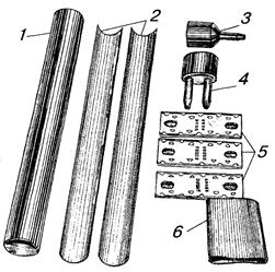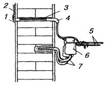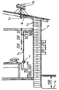 1 - изоляционная втулка; 2 - провод ЛТВ-В (ЛТР-В); 3 - резиновая или эбонитовая трубка; 4 - изоляционная воронка; 5 - линейные провода; 6 - изоляторы; 7 - крюки