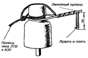 Провода ЛТВ (ЛТР) подключаются к АЗУ, установленному в помещении абонента на расстоянии 0,5 - 1 м от отверстия ввода. От АЗУ до телефонного аппарата прокладывается однопарный провод (ТРП, ТРВ). Отверстие для заземляющего провода АЗУ просверливают в оконной колоде ниже отверстия ввода на 50 - 60 мм. Монтаж АЗУ показан на рис. 10.3.