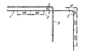Для разрядников, расположенных внутри здания, токоотводы от заземлителей следует прокладывать по стене до ввода в здание. Перед вводом в здание проводник от заземлителей припаивают к изолированному проводу сечением не менее 1,5 мм2 и через отдельное отверстие в стене проводят непосредственно к разряднику. Молниеотвод, прокладываемый по стене здания, необходимо закрыть деревянной рейкой на высоту 2,5 м от уровня земли.