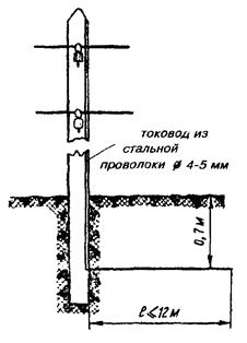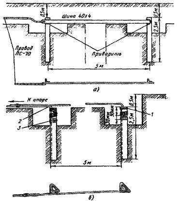 Если заземление предназначено для кабельного ящика, запирающей или дренажной катушки, то от заземлителей вдоль опоры прокладывают два токоотвода из проволоки диаметром 4 - 5 мм, один из которых присоединяют к корпусу кабельного ящика или к заземляющему зажиму запирающей катушки, а другой прокладывают до вершины опоры.