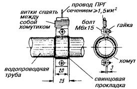 В качестве заземлителей для абонентской аппаратуры СТС и защиты абонентов и оборудования на абонентских линиях могут быть использованы водопроводные трубы. В этом случае проводник присоединяют к водопроводной трубе, как показано на рис. 18.12. Для создания хорошего контакта трубу, хомутик и свинцовые прокладки предварительно зачищают до металлического блеска. Водомер необходимо зашунтировать перемычкой, включенной между двумя контактными хомутиками, установленными по обе его стороны.