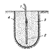 б) после установки электрода (уголка, трубы) заполнить котлован грунтом с небольшим удельным сопротивлением и грунт утрамбовать.