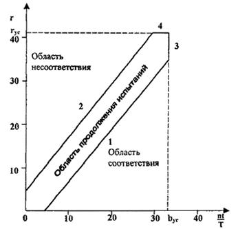 А.2.6 По уравнениям выбранного плана контроля испытаний определяют линии границ области соответствия r1, области несоответствия r2 и значения bус, rуc, необходимые для графического представления плана контроля испытаний.