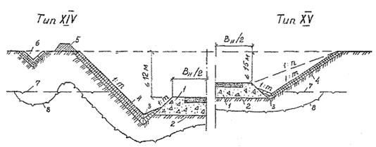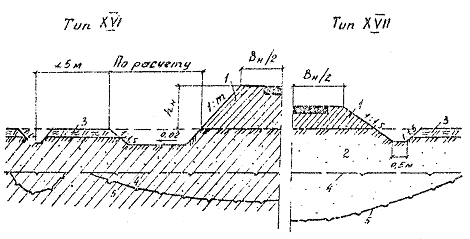 При проектировании автомобильных дорог по принципу обеспечения оттаивания и осушения грунтов основания с учетом допускаемых деформаций земляное полотно конструируют в насыпях (рис. 8.11, типы ХVI, ХVII). При этом необходимо не менее чем за год до начала основных работ расчистить дорожную полосу от леса и кустарника, сплошь снять мохорастительный покров в пределах дорожной полосы и устроить водоотводные канавы.
