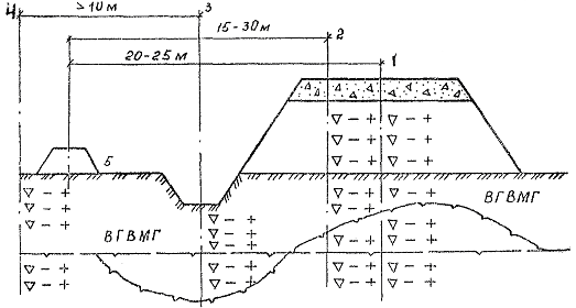 1 - измерительная вертикаль по оси дороги; 2 - то же на обочине; 3 - то же посередине кювета; 4 - то же на границе полосы отвода; (+) - термометры; (-) - влагомеры; 5 - пост наблюдения и М.Рп.