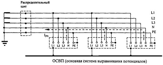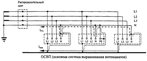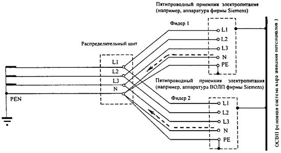 Рисунок Б.4 иллюстрирует желаемую ситуацию. В этом случае на фидере питания с трехфазной пятипроводной системой проводников устанавливается только аппаратура, требующая питания по пятипроводной схеме.