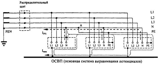 Рисунок Б.1 - Распределение токов нулевого рабочего проводника (N) в трехфазной четырехпроводной системе токоведущих проводников электропитающей сети переменного тока при совмещении на одном фидере аппаратуры с четырехпроводным и пятипроводным питанием