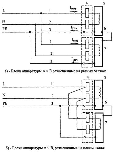 На рисунке Б.7а два блока аппаратуры питаются от двух отдельных фидеров, но корпуса обоих блоков заземлены через собственные защитные проводники. В этом случае разность потенциалов между корпусами минимальна и определяется разностью падений напряжений, образующихся на нулевых защитных проводниках протекающими по ним токами утечки (Iутечки ≈ 0).