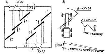 Рис. 2. Схема проходов автогрейдера при втором цикле: а - схема проходов автогрейдера; б - углы установки отвала в рабочее положение |