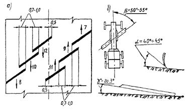 Рис. 1. Схема проходов автогрейдера при первом цикле: а - схема проходов; б - углы установки отвала в рабочее положение |