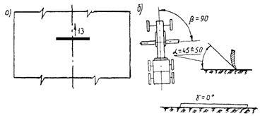 Рис. 3. Схема прохода № 13 автогрейдера при третьем цикле: а - схема прохода автогрейдера; б - углы установки отвала автогрейдера в рабочее положение |