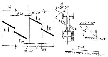 Рис. 4. Схема проходов 14 - 17 автогрейдера при третьем цикле: а - схема проходов; б - углы установки автогрейдера в рабочее положение |