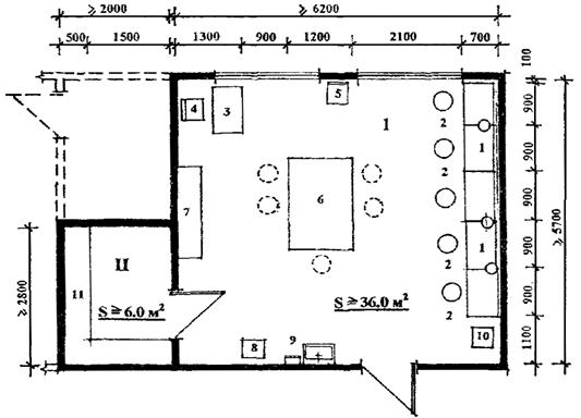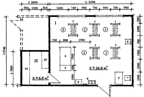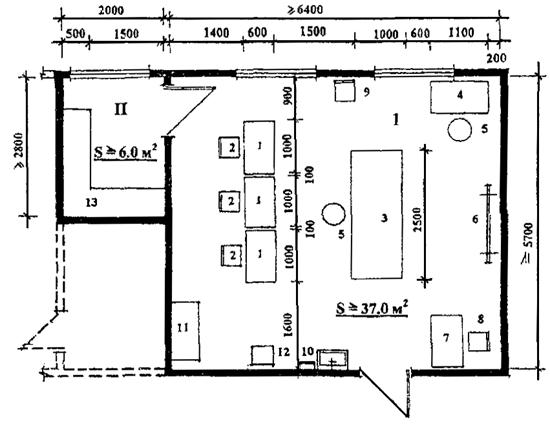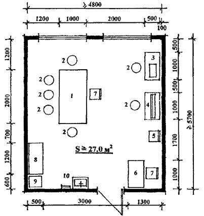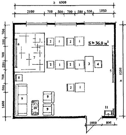 1. Высокий стол для раскроя тканей; 2. Стол со швейной машиной; 3. Регулируемый табурет; 4. Манекен; 5. Гладильная доска; 6. Кронштейн для выполняемой продукции; 7. Стул воспитателя; 8. Стол мастера; 9. Стул мастера; 10. Умывальник с вешалкой для полотенца; 11. Урна для мусора