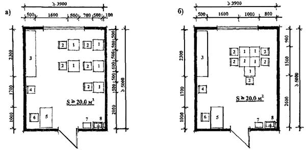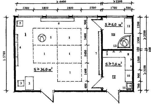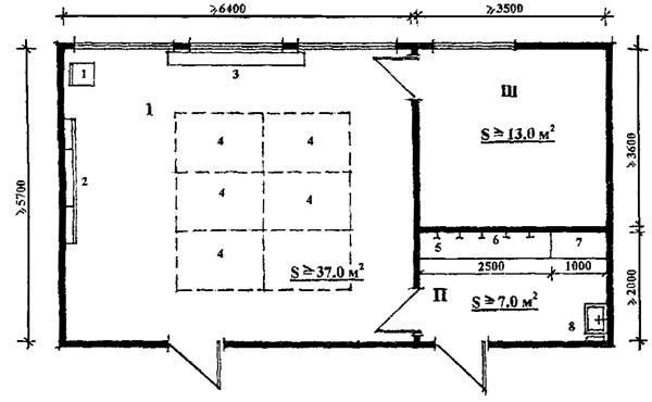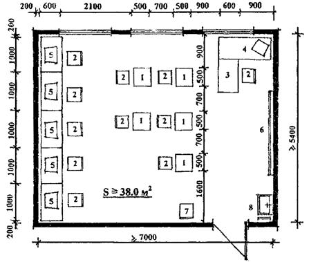 5. Скамья для переодевания; 6. Крючки для одежды; 7. Шкаф методиста; 8. Умывальник с вешалкой для полотенца