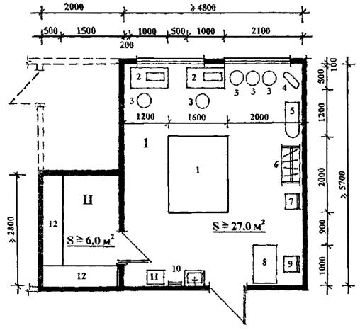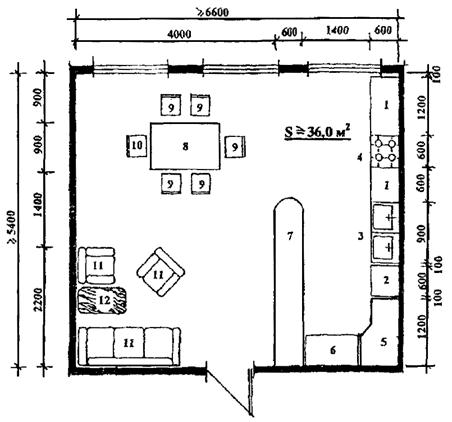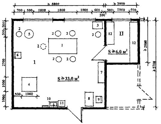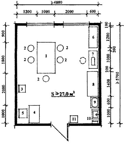 1. Стол-шкаф кухонной посуды; 2. Холодильник; 3. Мойка; 4. Электроплита с воздухоочистителем; 5. Шкаф для сухих продуктов; 6. Шкаф для столовой посуды; 7. Высокая сервировочная стойка - разделочный стол; 8. Обеденный стол; 9. Стул воспитанника; 10. Стул воспитателя; 11. Мягкая мебель; 12. Журнальный столик
