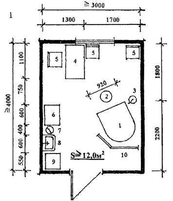 1. Кресло стоматологическое; 2. Столик инструментальный; 3. Установка стоматологическая универсальная; 4. Винтовой табурет; 5. Плевательница; 6. Светильник; 7. Шкаф медицинский; 8. Умывальник; 9. Бачок для мусора; 10. Стол врача; 11. Стул