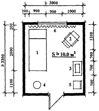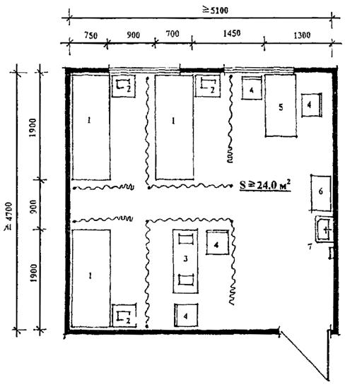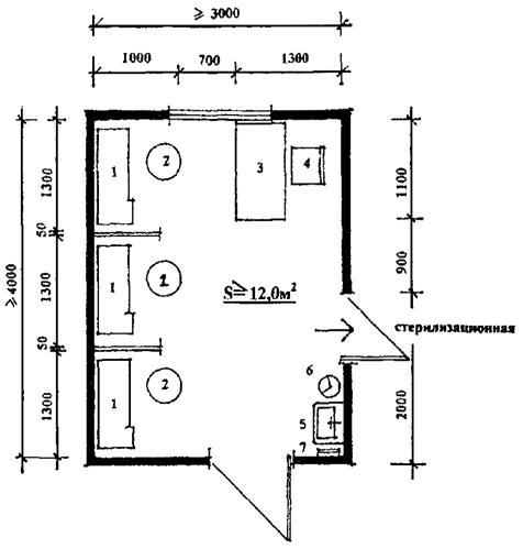 1. Кушетка; 2. Столик c аппаратурой; 3. Столик с аппаратурой для приема процедур сидя; 4. Стул; 5. Стол врача; 6. Шкаф медицинский; 7. Умывальник с вешалкой для полотенца