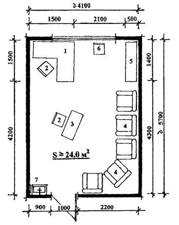 1. Стол специалиста с компьютером; 2. Стул специалиста; 3. Журнальный стол; 4. Мягкая мебель; 5. Шкаф; 6. Стул воспитателя; 7. Умывальник с вешалкой для полотенца