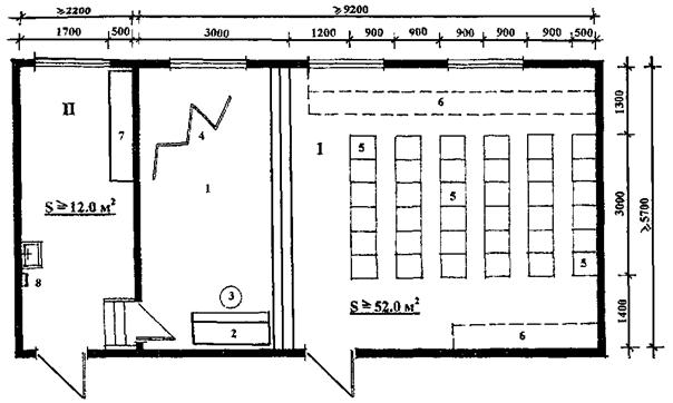1. Ученический стол; 2. Стул; 3. Стол преподавателя; 4. Компьютерный стол преподавателя с компьютером; 5. Ученический стол с компьютером; 6. Классная доска; 7. Стул воспитателя; 8. Умывальник с вешалкой для полотенца