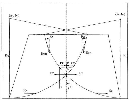 В верхней части насыпи возникают переменные по высоте симметричные сжимающие усилия, определяемые левой и правой дугами. Обе силы величиной Ez = EoпSina направлены навстречу друг другу с точками приложения на соответствующих дугах. Сжимающий эффект таких сил будет обеспечиваться до тех пор, пока их векторные величины не встретятся на оси дороги (т. Z¢ на рис. 6). При расположении горизонтов армирования выше такой точки нет необходимости учитывать условия совместной работы левой и правой дуг при определении растягивающего усилия. Начиная с высотной отметки, определяемой т. Z¢, суммарный баланс двух встречных сил Ez создает растягивающий эффект. При этом для некоторой точки Zв растягивающий баланс таких сил вертикали, проходящей через ось дороги, становится эквивалентным Ez.