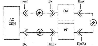 7.1.4.3 Фазовое дрожание оптического сигнала на выходе регенератора измеряется с помощью АС СЦИ, вход которого подключается к точке Пд (S) регенератора по схеме, приведенной на рисунке 5, при подаче на вход регенератора, точка Пp (R), через оптический аттенюатор (ОА) сигнала, в котором отсутствует фазовое дрожание. С помощью ОА устанавливается затухание между выходом АС СЦИ и входом регенератора в пределах диапазона перекрываемого затухания в соответствии с кодом применения по ОСТ 45.104.