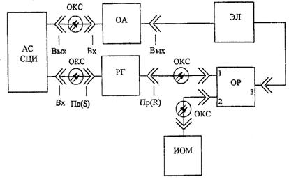 7.3.1.4 По схеме, приведенной на рисунке 11, измерение уровня чувствительности регенератора проводится с помощью ИОМ и ОА с использованием ОР 2×1.