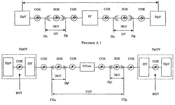 На рисунке А.2 представлен вариант оптической цепи с ОУ, которая состоит из двух вспомогательных оптических трактов (ВОТ) и одного главного оптического тракта (ГОТ). В состав ГОТ входят два ЭКУ и один промежуточный ОУ (ОУпм). Как видно из рисунка, число ОУпм всегда на единицу меньше числа ЭКУ в ГОТ. Точки нормирования ГПд, Пд, Пр, и ГПр определяются в месте соединения СОК и ЛОК.