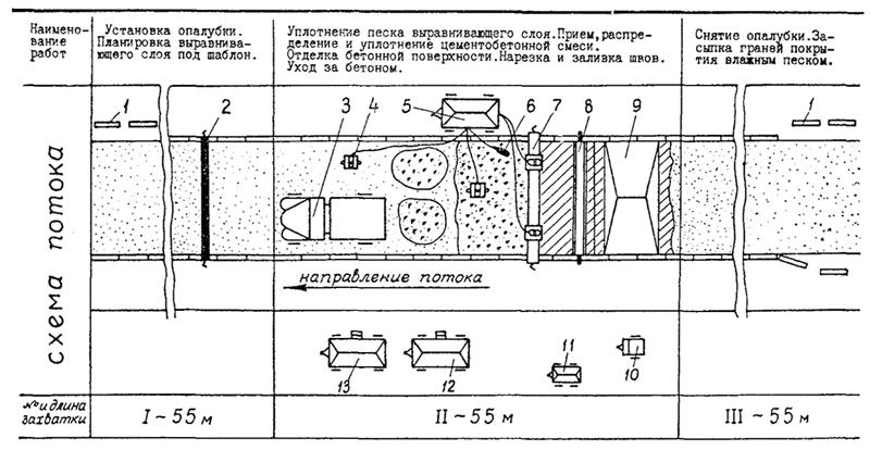 1 - опалубка; 2 - шаблон; 3 - автомобиль-самосвал; 4 - поверхностный вибратор; 5 - электростанция; 5 - глубинный вибратор; 7 - виброрейка; 8 - переносной мостик; 9 - переносной тент; 10 - емкость для воды; 11 - передвижной туалет; 12 - прицепной вагончик для ИТР и кладовая; 13 - прицепной вагончик для рабочих