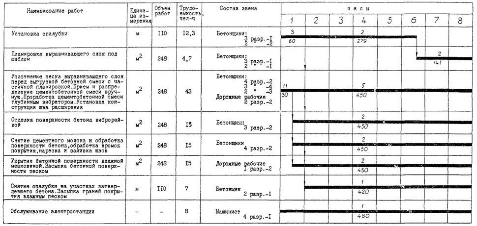 Уплотнение песка выравнивающего слоя, устройство бетонного покрытия и нарезку швов производит звено рабочих в составе:
