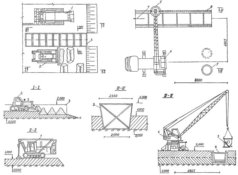 1 - автокран КС-3562Б; 2 - стеновые блоки; 3 - сборный железобетонный коллектор серии 3.006-3; 4 - грунтоуплотняющая машина ДУ-12А; 5 - бульдозер ДЗ-42