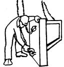 ПОДГОТОВКА ЛЕСТНИЧНОГО МАРША К УСТАНОВКЕ; РАЗМЕТКА МЕСТ УСТАНОВКИ; М2, М3 - 6 мин; М1 - 3 мин; захваты, молоток-зубило, шаблон Монтажник М3 осматривает лестничный марш и счищает монтажные отверстия. Монтажник М2 вставляет стержни коромысловых захватов в монтажные отверстия одной полуплощадки лестничного марша и поворачивает коромысла параллельно маршу. Аналогично монтажники устанавливают два захвата на другой полуплощадке марша. Монтажник М1 при помощи шаблона размечает места установки лестничного марша |
